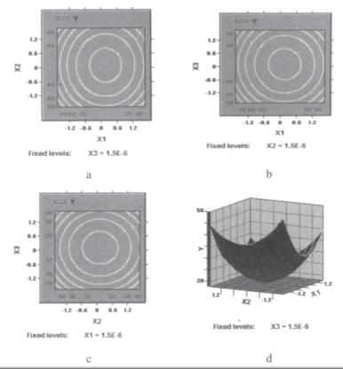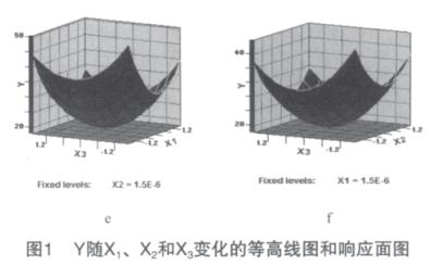 利用響應(yīng)面分析法[1]化枸杞子渣超微粉碎工藝參數(shù)。在單因素預(yù)試驗基礎(chǔ)上,用SAS軟件系統(tǒng)進行響應(yīng)面分析,設(shè)計一個三因素五水平的回歸方程來擬合因素和指標(響應(yīng)值)之間的函數(shù)關(guān)系。選擇球料比(X1)、枸杞子渣漿液濃度(X2)和攪拌器轉(zhuǎn)速(X3)作為因素,以粉碎后的顆粒粒度d50作為響應(yīng)值對球磨機濕法超微粉碎工藝進行化。